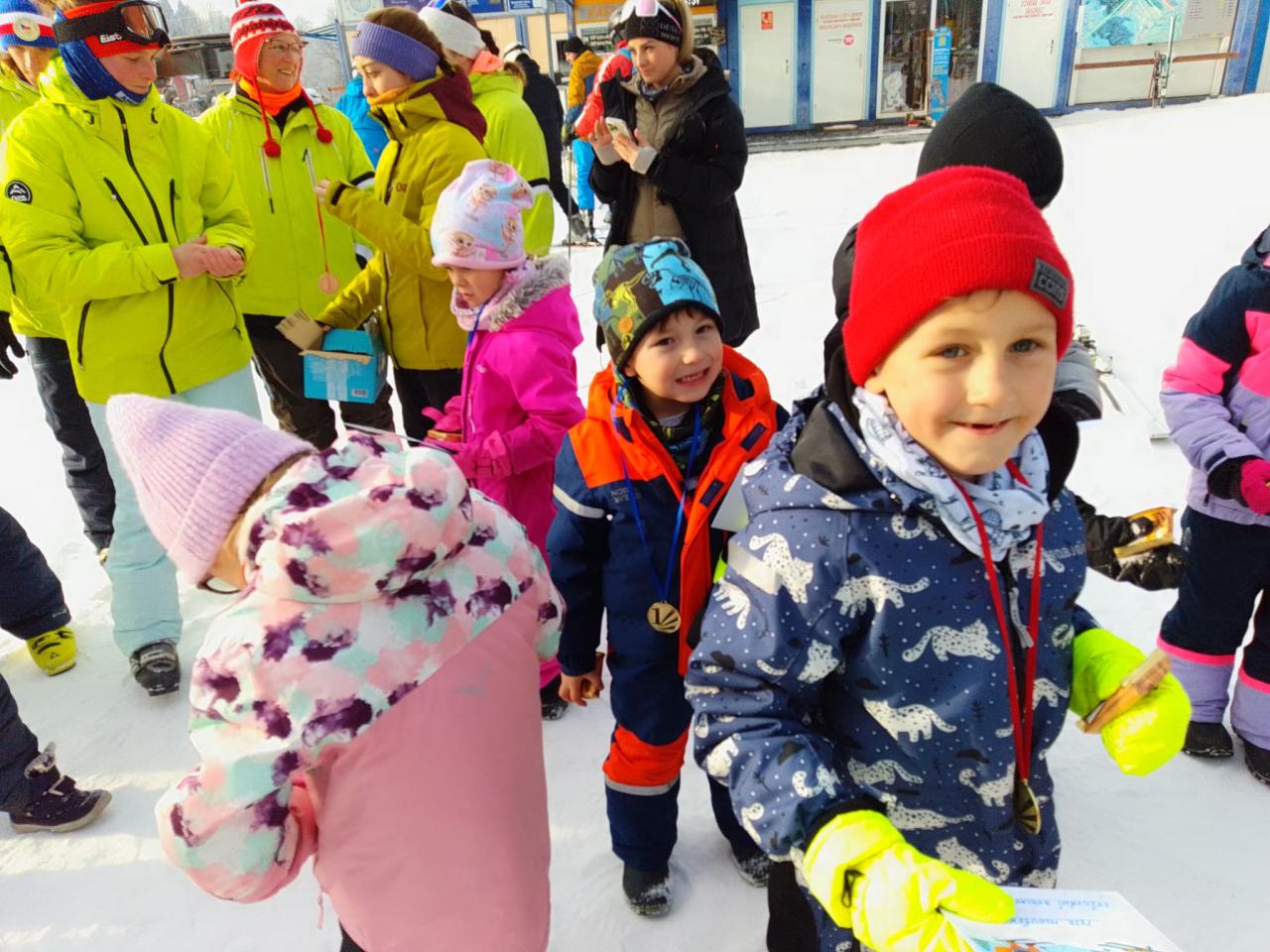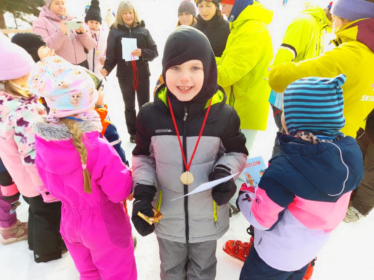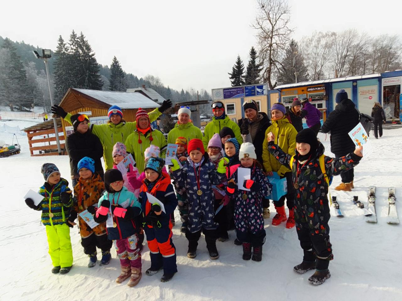 Lyžařský týden jsme završili závěrečným slalomem. Všichni si zasloužili medaili, diplom a sladkou odměnu. Na závěr "Ahóóój!". A zase příští rok společně - nebo třeba hned o víkendu s rodiči.