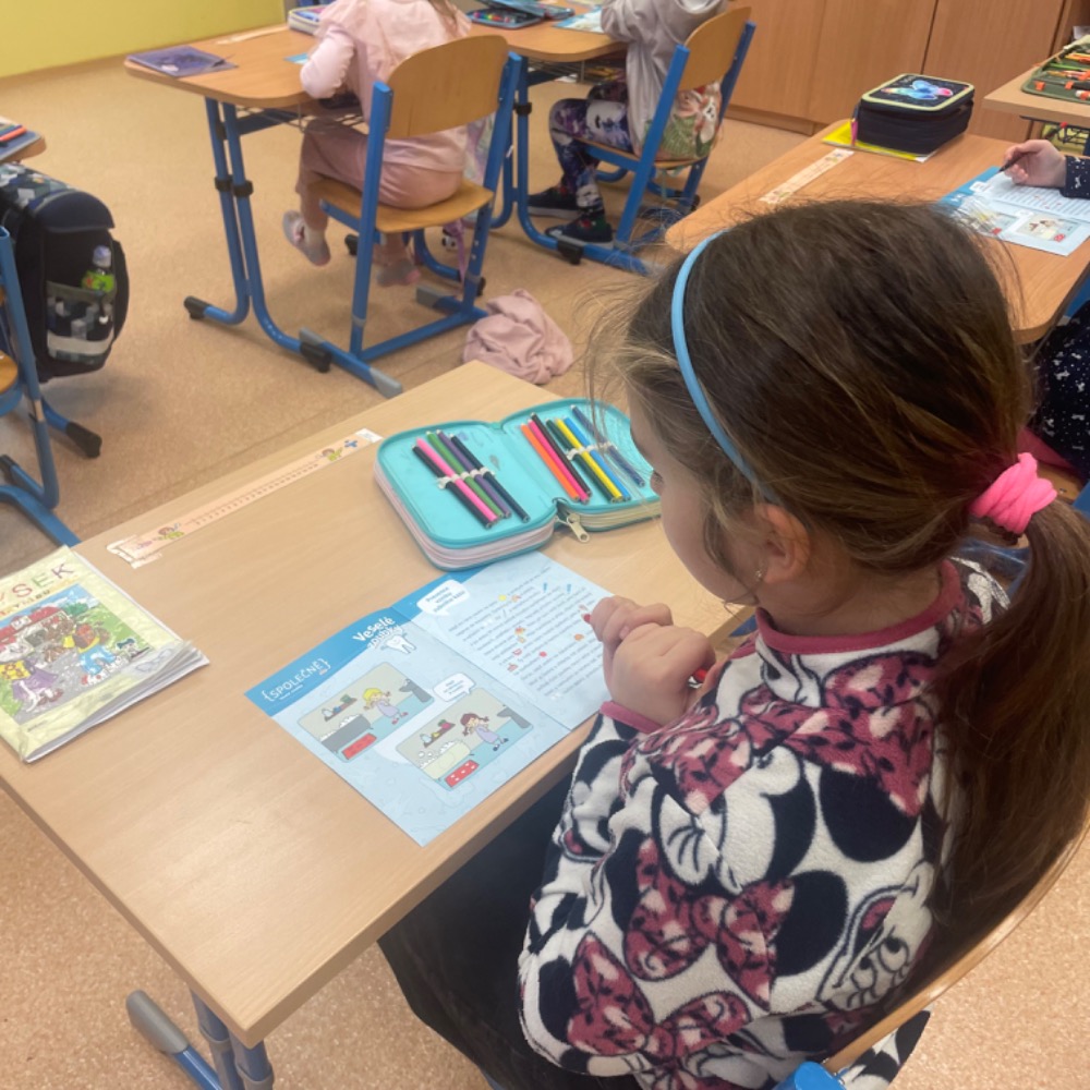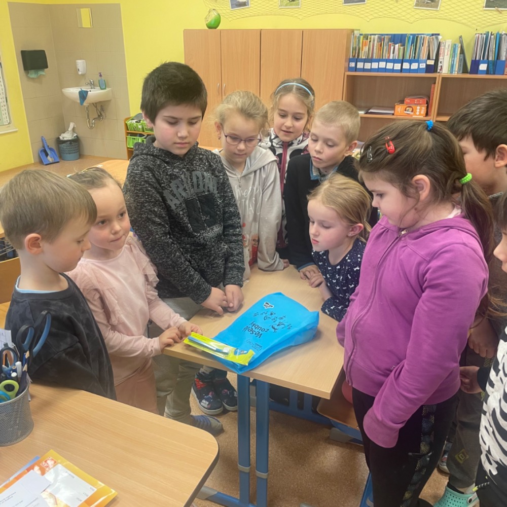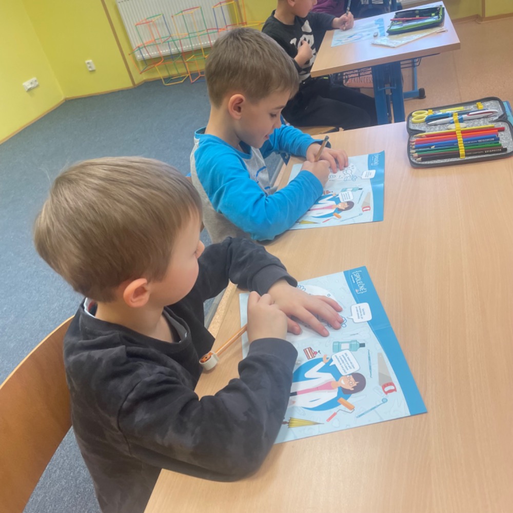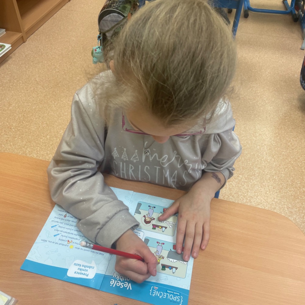 Poslechli jsme si kamaráda Hurvínka, vyprávěli si své zážitky z péče o chrup, vysvětlili si základní informace o zubech a nutnost pravidelných prohlídek u zubního lékaře, ukázali si správné čištění i další péči, zahráli si domino, luštili křížovku s tajenkou. Slíbili jsme si, že o své zoubky budeme opravdu řádně pečovat. Naši prvňáčci byli moc šikovní, a tak si za odměnu odnesli balíček připravený společností dm, samolepku a pochvalu v notýsku.