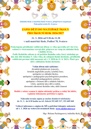 Vážení zákonní zástupci, zde naleznete informace týkající se zápisu k předškolnímu vzdělávání v naší mateřské škole pro školní rok 2026 - 2027